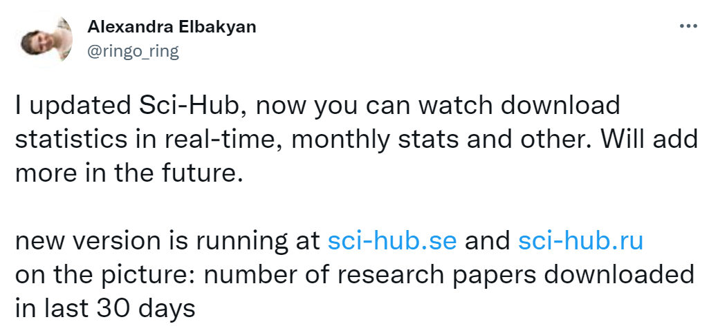 科研界女神、Sci-Hub 创始人 Alexandra Elbakyan 今日发了一条推特,立刻引来科研圈的关注。Elbakyan 表示:「 Sci-Hub 更新了,现在用户可以实时查看下载统计、每月统计等,并在将来会增加更多内容。」