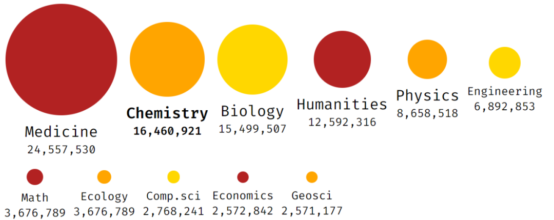 份研究论文的数据库,它们都可以免费下载。就学科而言,这些研究论文涵盖了医学、化学、生物学、人类学、物理学、工程学、数学、生态学、计算机学以及地球科学。其中,占比最多的学科是医学,大约有 2,500 万,来自医疗与健康期刊。紧接着是化学、生物学、人类与社会学等。