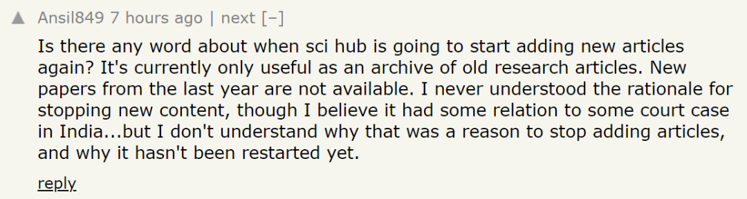 不过,对于 Sci-Hub,网友依然提出了一些疑问。网友 Ansil849 想知道 Sci-Hub 何时才能够重新开始添加新论文,目前仅用作旧论文的存档,甚至 2021 年的新论文都无法获取。虽然知道这肯定与印度的一些起诉案件有关,但不理解为什么这就成为了停止添加新论文的原因以及为什么还没有启动添加新论文。