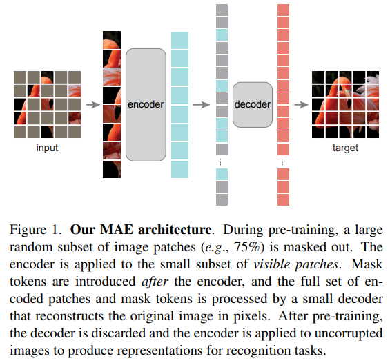 该 MAE 从输入图像中掩蔽了随机 patch 并重建像素空间中缺失的 patch。