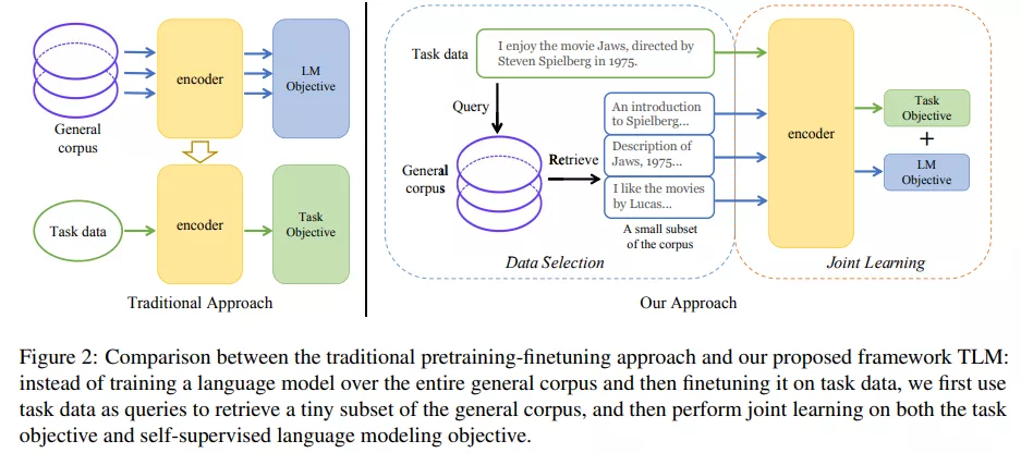 为了从大规模通用语料中抽取关键数据,TLM 首先以任务数据作为查询,对通用语料库进行相似数据的召回。这里作者选用基于稀疏特征的 BM25 算法 [2] 作为召回算法。之后,TLM 基于任务数据和召回数据,同时优化任务目标和语言建模目标 (如下图公式所示),从零开始进行联合训练。