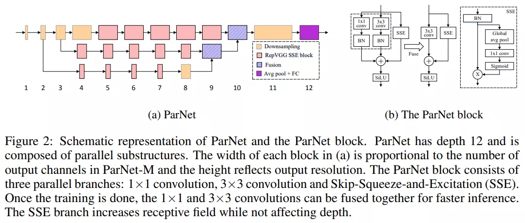 该研究提出了一种深度较低但仍能在多项基准上实现高性能的网络架构 ParNet,ParNet 由处理不同分辨率特征的并行子结构组成。这些并行子结构称为流(stream),来自不同流的特征在网络的后期融合,融合的特征用于下游任务。图 2a 提供了 ParNet 的示意图。