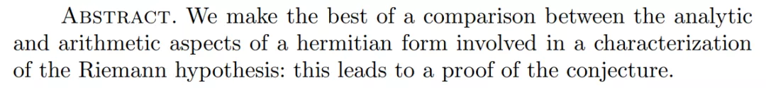 近日兰斯大学的 Andre Unterberger 在 arXiv 上传论文《A pseudodifferential proof of the Riemann hypothesis》,对黎曼猜想涉及到的厄米特形式(hermitian form)的分析和算术部分进行了详尽的比较,从而证明了该猜想。