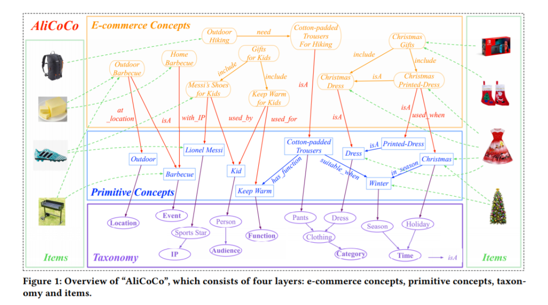 电子商务平台的终极目标之一就是满足客户的各种购物需求。为了实现这一目标,电子商务中的许多工作都致力于创建分类法或本体。然而,电子商务中的用户需求仍然没有得到很好的定义,现有的本体都没有足够的深度和广度来理解普遍的用户需求。语义上的鸿沟阻碍了购物体验的智能化。在本文中,我们提出构建一个大型的电子商务认知概念网“AliCoCo”,并在全球最大的中国电子商务平台阿里巴巴进行实践。我们正式地定义了电子商务中的用户需求,然后将其概念化为网络中的节点。我们将详细介绍AliCoCo是如何半自动构建的,以及它在电子商务中的成功、持续和潜在应用。