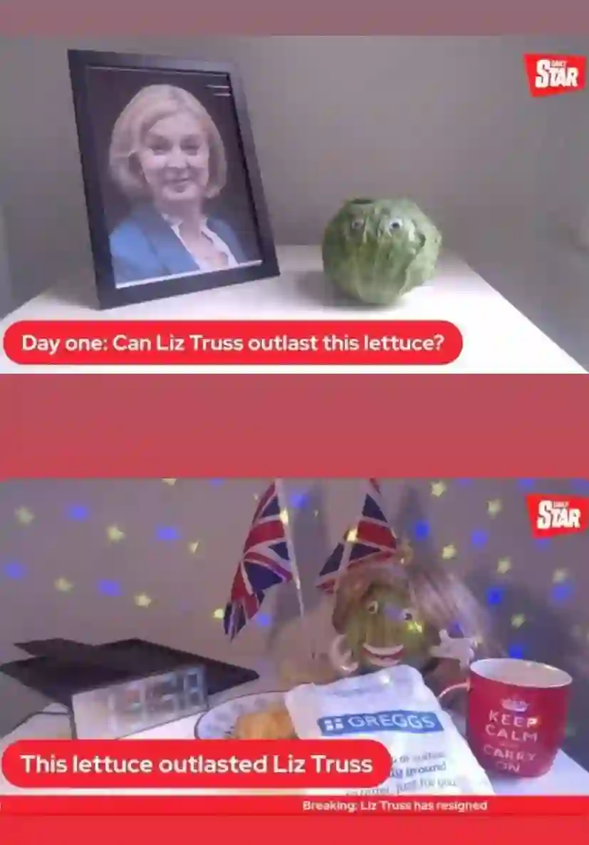 在特拉斯一系列的谜之操作和内阁成员的众叛亲离后,《每日星报》更是在网络上做了一场比赛直播,讽刺特拉斯的首相寿命还没有一颗生菜的保质期长。