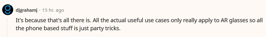 「其实这也不难理解。真有用的东西都是跟 AR 眼镜有关系的,凡是在手机上的跟 AR 上有关的东西都没啥用,小把戏罢了。」