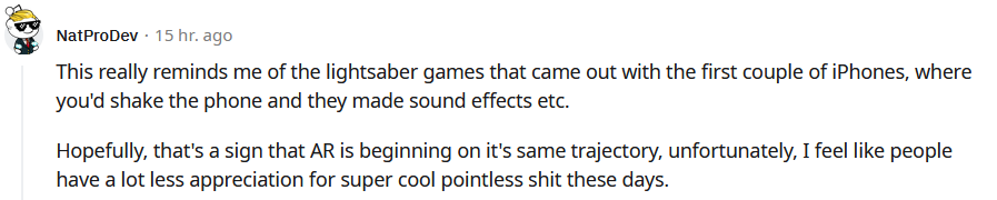 「这东西让我想起了刚开始那几代 iPhone上的光剑游戏,当时玩儿那个游戏晃手机就会有那种音效。幸运地是,今早发布的这个新视频表明 AR 正往那个方向发展。但不幸地是,我看现在人们对这种没什么大用、但酷毙了的东西都不感冒了。」