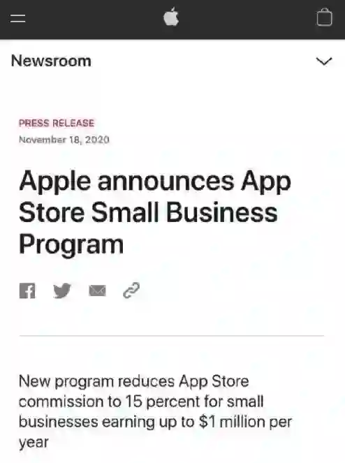 今天苹果正式推出 App Store ⼩型企业和个体开发者计划,针对每年营收少于 100 万美元的⼩型企业和个体开发者采取降低抽成佣金的措施,App Store 佣⾦降⾄ 15% ;该计划将于 2021 年 1 ⽉ 1 ⽇正式启动。