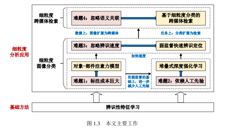 细粒度分析旨在对粗粒度的大类进行细粒度的子类划分,如把鸟划分为里海燕鸥、 北极燕鸥等子类别。其广泛应用于智能农业、智能医疗等智能产业,具有重要的研究 和应用价值。其挑战在于类间差异小、类内差异大。以图像为例,不同子类别在形状、 颜色上差异细微,难以区分;相同子类别在姿态、视角上差异显著,容易误分。因此, 关键科学问题是:如何获取细粒度子类别的辨识性信息并有效表达,突破细粒度分析难题。针对上述问题,本文从减少标注成本、减少人工先验、提高辨识速度、提高语义 关联四个方面展开辨识性特征学习研究,并分别应用于细粒度图像分类和细粒度跨媒 体检索任务。主要工作总结如下: