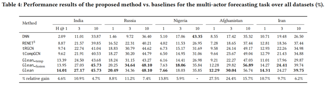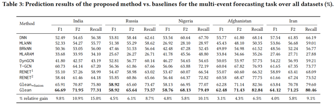 本文测试了模型在事件预测,如表3所示,和事件参与者预测,如表4所示,的效果。评价指标采用了预测常用的指标F1、F2、Recall,以及排名问题常用指标H@X。Glean-fusion、Glean-temp分别表示省略事件预测中的Context-aware Embedding Fusion模块,以及省略事件参与者预测的temporal inference 模块。可以看出在事件预测部分Glean的效果普遍优于目前的基线方法。在事件参与者预测部分,Glean与Glean-fusion的效果相差不大,一个可能的原因是,在图采样之后,word subgraph可能没有包含足够的语义信息,从而使融合的嵌入变得毫无用处。它还证明了关系信息在预测事件参与者中的重要性。