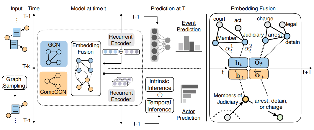 本文方法的框架结构,如下图所示。主要由3部分构成,首先利用GCN和CompGCN对Temporal Event Graph 和 Temporal Word Graph进行建模,学习节点表示。其次,基于Attention机制,对Temporal Event Graph和Temporal Word Graph的节点表示进行融合。最后,利用RNN,对时间信息进行编码,完成事件预测和事件参与者预测任务。