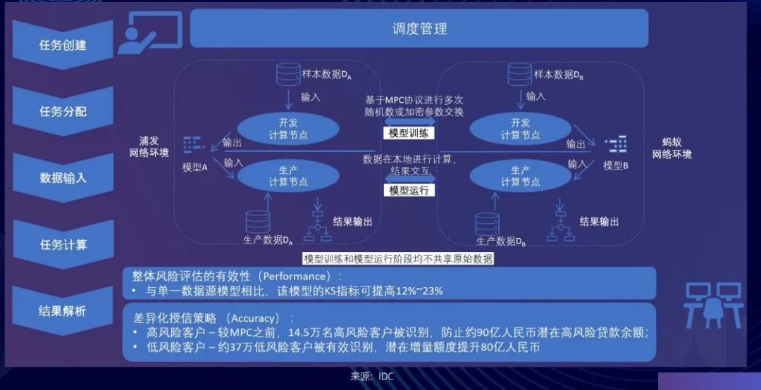 基于这样的隐私保护技术,我们跟浦发银行做了联合风控的应用。我们在已经授权的数据上进行了尝试,使得模型训练和模型运行阶段均不共享原始数据。与单方面运算相比,联合运算的模式能够更好地提升模型的性能指标(比如将 KS 指标提升 12%~23%)。将模型产出的结果运用到风控场景中,我们能比较好地实现差异化的授信策略,防止潜在高风险贷款,从而将合适的贷款给到合适的人,真正实现防范金融风险的目的。