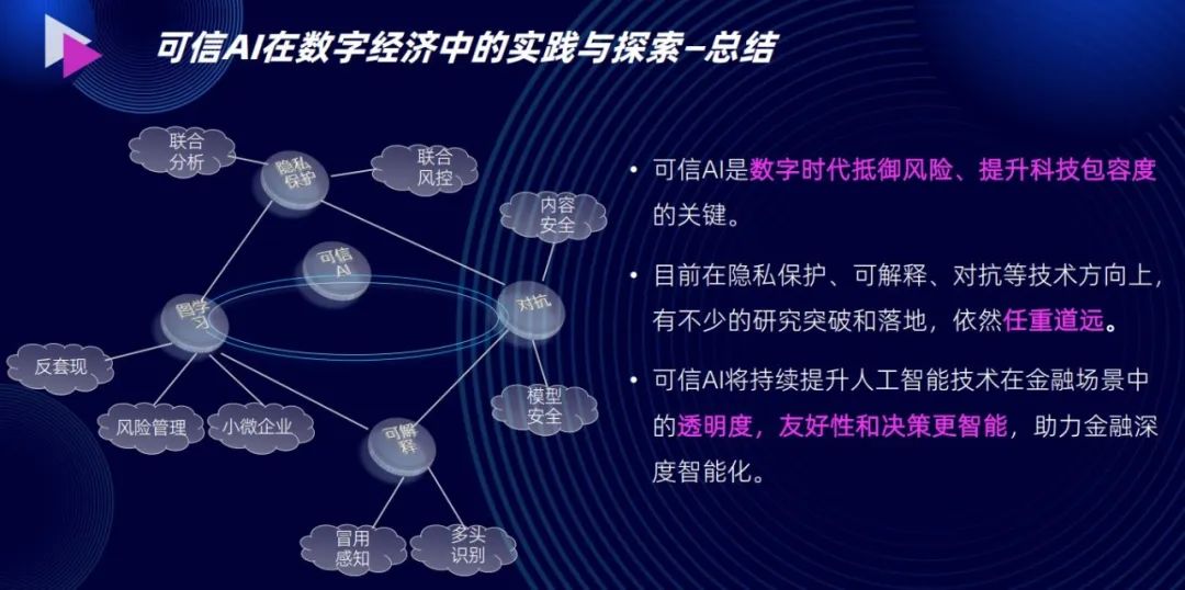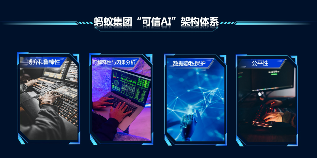 我们在打造数字经济平台的过程中也联合了很多外部的高校,着力发展出了可信 AI 的技术。我们希望可信 AI 在数据隐私保护、可解释性和因果分析、公平性和安全性(鲁棒性)方面都能有比较好的能力,这样才能满足公众或者业界对 AI 的期待。