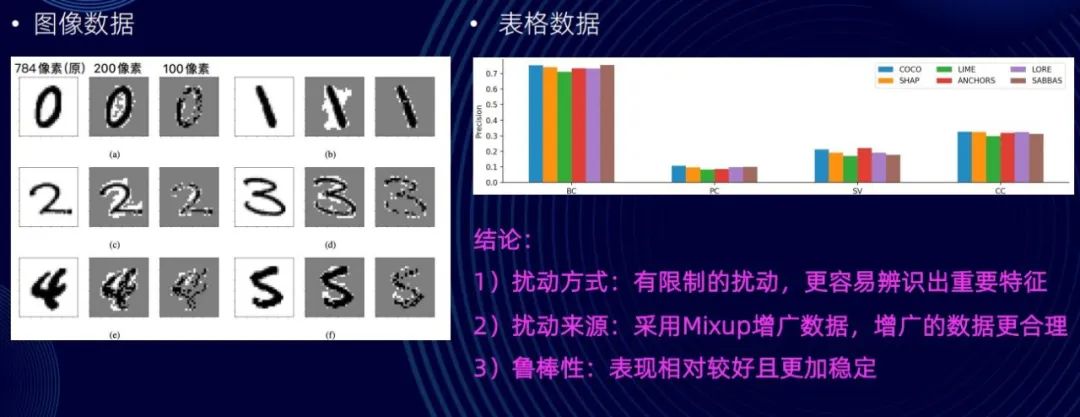 在图像数据上面,我们这个方法筛选出了前 200 个重要特征。画成图的话,这些特征基本上贴合在数字的边界上,这样一看就知道挖掘出来的重要特征确实在上面。在工业界中常用的表格上面,我们也会先把重要特征挖掘出来,再训练成模型,然后看模型挖掘出来的重要特征和其他方式(如 SHAP、LIME)挖掘出的特征精度效果的对比。可以看到,我们的方法在精度上有比较好的效果。