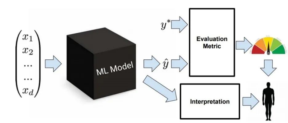 现在很多 AI 的方法都是一个黑盒模块(下图),人们对中间的过程并不是特别了解。我们希望通过可解释的机器学习,让黑盒由黑变灰(在一定程度上可解释),并最终变成白盒(完全可解释)。可解释机器学习使得机器学习模型能够以易于理解的方式向用户解释或呈现其行为。