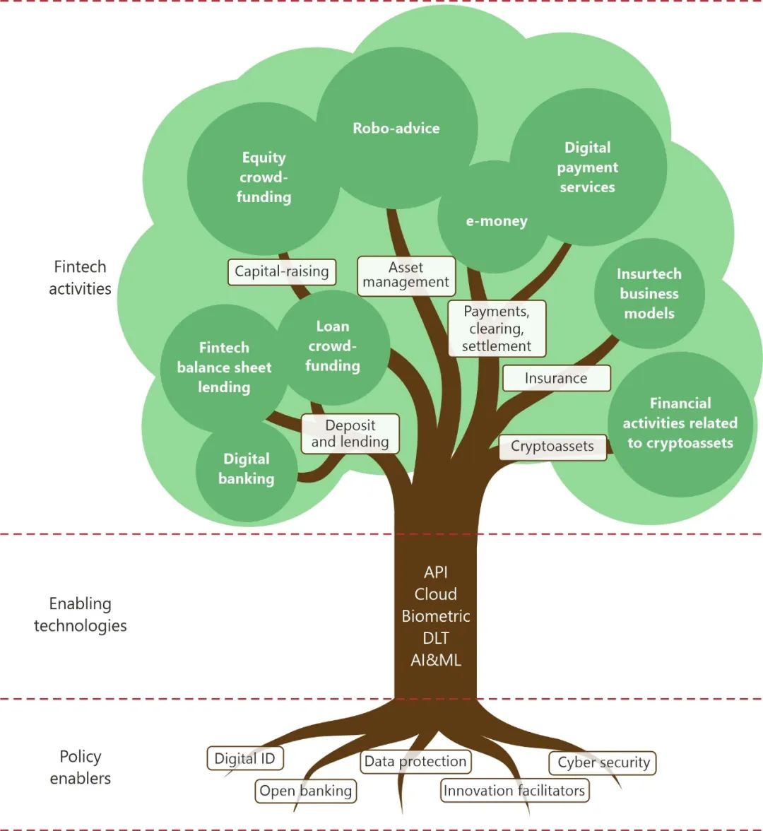 具体到数字经济中,我们可以看到,在国际清算银行给出的金融科技框架里,AI 得到了广泛的应用。树干中的人工智能、云计算等技术成为了金融科技的核心,并且承载了非常重要的承上启下的作用。