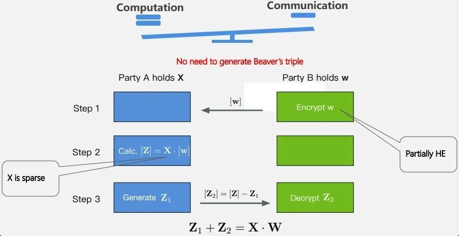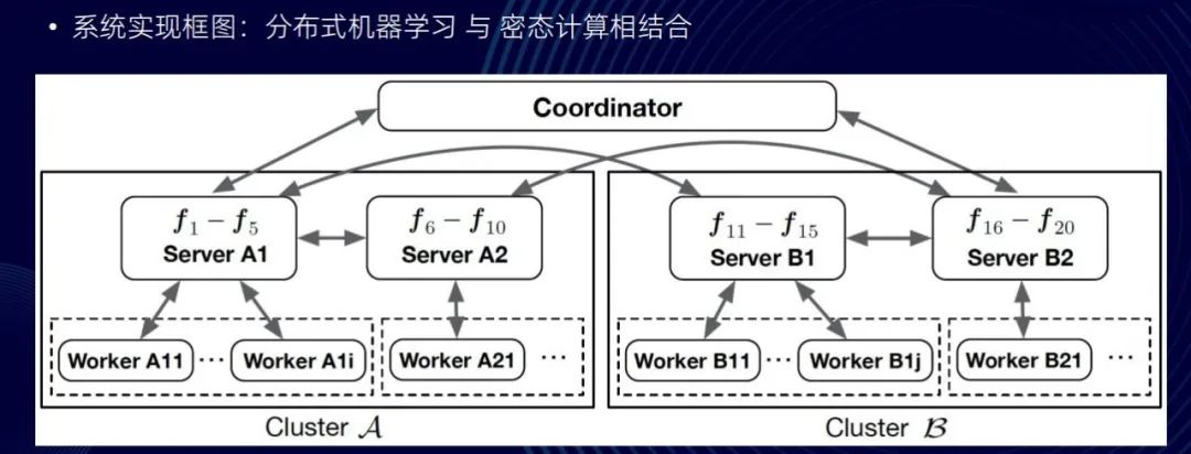 这里面的要点包括:1)稀疏的矩阵乘法,我们通过混合的 MPC 协议,在合适的地方选择合适的协议,不需要产生 Beaver’s triple,能够更好地提升效率;2)安全、稀疏的矩阵运算,能够同时交叉利用秘密分享和同态加密的技术,最后结合分布式计算,在协调器的指挥下充分利用已经有的集群资源。每个集群本身也是分布式的学习系统,通过这样的方式,我们能够非常好地去进行分布式的运算,然后再通过整体的协调器的协调来完成最终的运算。