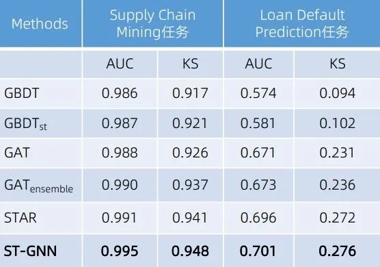 我们跟一些传统方法(如 GBDT、GAT)做了对比。结果显示,我们这个结合了时空信息的方法能够在中小企业的金融诉求预测上大幅改进模型的性能。主要原因在于,我们的方法结合了很多图上面的信息,而且设计了时空注意力的机制,能够比较好地融合多元、多维度的信息,体现出企业之间比较复杂的族群相关度,从而识别中小企业的信用评分,基于这样的信用评分助力他们享受对应的金融服务。