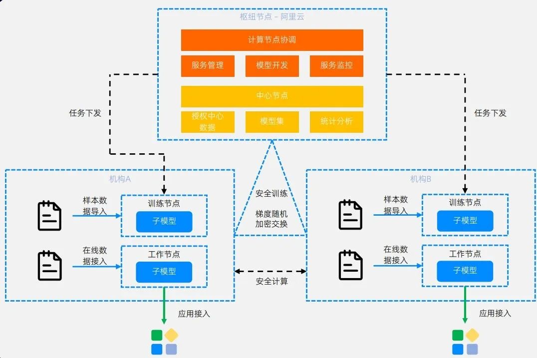 同时,我们也将这样的技术应用到了联合分析和知识融合等场景 [9]。其核心技术可以概括为:基于云计算和可信隐私计算技术,通过模型梯度和参数安全共享来实现价值的流通,这可以应用于机构内部的运营优化和机构之间安全共享信息。比如我们可以通过隐私保护知识图谱等技术,实现机构之间领域知识融合,提升实体识别准确率,助力保险疾病、证券分析等应用。