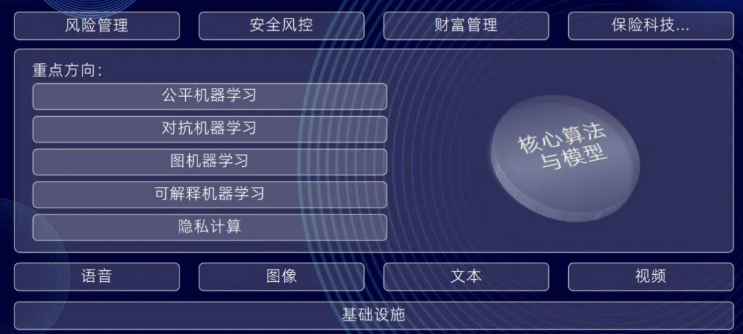 为了实现可信 AI 的技术,我们在跟数字经济结合的同时,沉淀了一些重点的方向,比如对抗机器学习、图机器学习、可解释机器学习、可信隐私计算等等。通过这些重点技术的研发,我们能够为风险管理、安全风控、财富管理等上层具体应用提供支撑,确保这些方法论能够被科学地定义、拆解成工程的目标,从而推出各种平台和工具,使得 AI 整个生命周期里都能应用「可信 AI」这样一个理念。