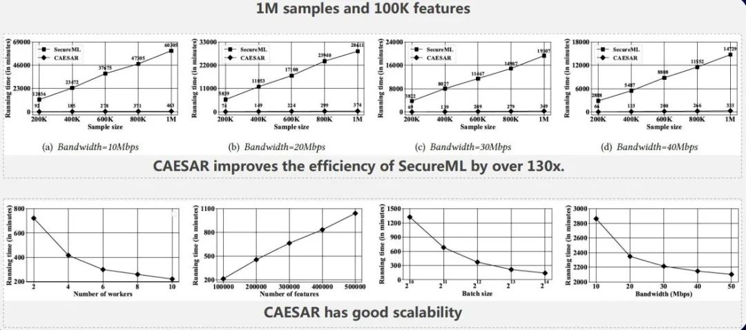 通过这种方式,我们发现 CAESAR 的效率达到了业界已有的 SecureML 方法的 130 倍左右。