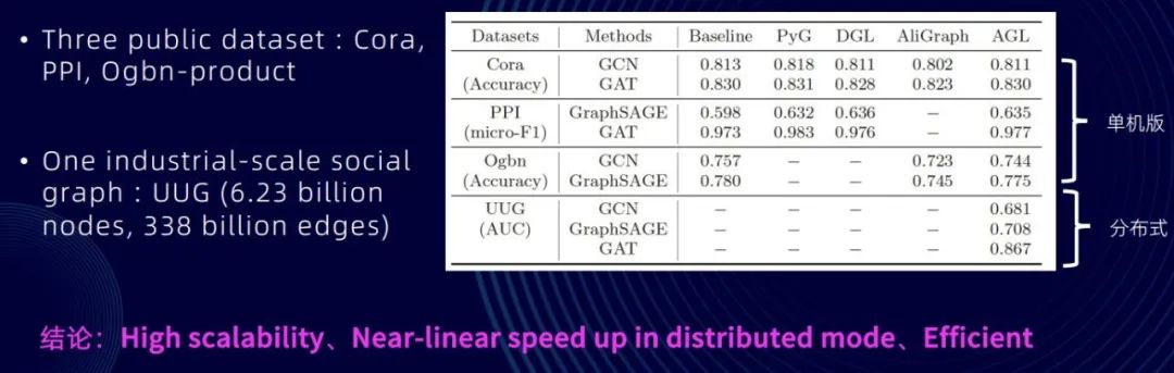 在 AGL 中,我们利用批处理框架如 MapReduce 来进行图样本生成,在训练期间设计了如边分区、图裁减和流水线并行等多种计算优化策略。我们能够看到,在一个比较大的工业级数据集上,在一个 62 亿节点、3300 多亿条边的真实的图数据上面,我们能够使用 3 万多个 core 完成真实系统的测试。也能够看到,在这样一个大规模数据集上面,我们的 AGL 系统能够具备近线性的加速比,并且有比较好的可扩展性,也为支持工业级规模的图机器学习的算法打下了比较坚实的基础。
