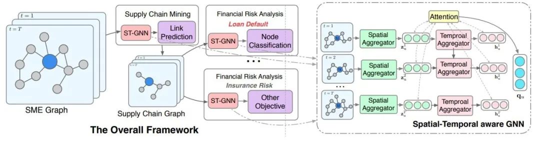 为此,我们提出了一个时空结合的 GNN(Spatial-Temporal aware Graph Neural Network,ST-GNN )[2]。首先,我们通过前面提到的供应链挖掘补足企业之间的关联,再结合图里面现有的一些风险标签,通过这个时空结合的 ST-GNN 方法,把这样一个问题转化成信用评分的问题,从而对整张供应链网络里面的企业完成信用评分,基于这样的信用评分评估这个企业违约的概率,从而满足他们金融上的诉求。
