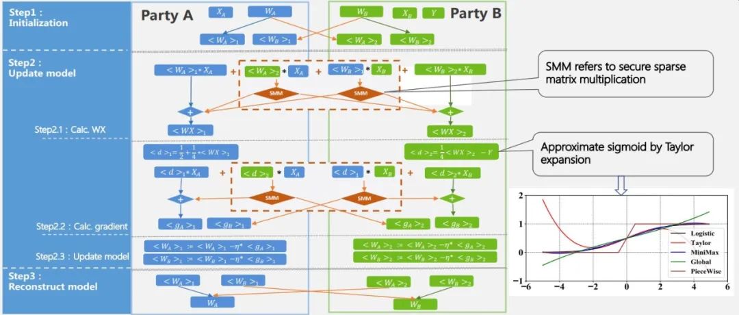 为此,我们提出了一种名为 CAESAR(Secure Large Scale Sparse Logistic Regression)[8] 的方法,它会基于混合 MPC 协议,设计出大规模隐私保护 LR 算法。