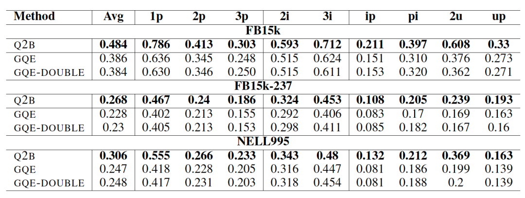 模型系统地在三个标准的知识图谱(FB15K,FB15K-237,NELL995)进行了评测,并与另一个相关的 baseline GQE (Hamilton et al., 2018)进行了对比: