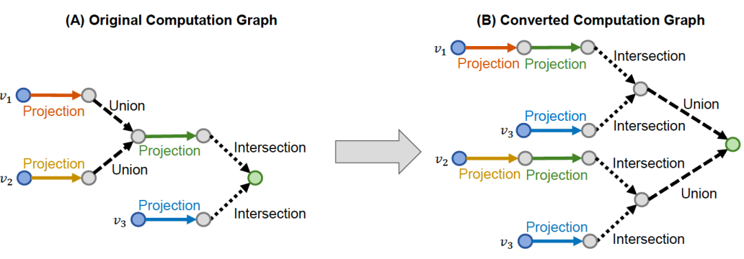 随后,又进一步加入了逻辑的析取表达。文中证明,若将析取也定义成与合取类似的逻辑向量操作的情况,那么生成的不同问题数量跟知识图谱的实体数目是成正比的,这将使模型很难泛化到大规模知识图谱中。所以文中提出将问题转换成一种由多个合取所组成的析取范式框架(Disjunctive Normal Form),将析取定义成对所有合取结果的最后一步合并操作,如下图: