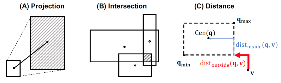 具体来说,box embedding 是由中心向量和偏移向量所组成,覆盖向量空间中的一定范围,所以,问题中的源实体也可以看成一种偏移量为零的特殊 box,通过一系列的逻辑向量操作,就可以得到最终的包含答案实体的 box。首先文中定义了合取式的逻辑向量操作,认为合取式都可以用俩种逻辑操作:Projection,Intersection 来表示。Projection 表示 KG 中的关系映射,也是由中心向量和偏移向量所组成;Interaction 表示多个 box embedding 的交集,如下图所示: