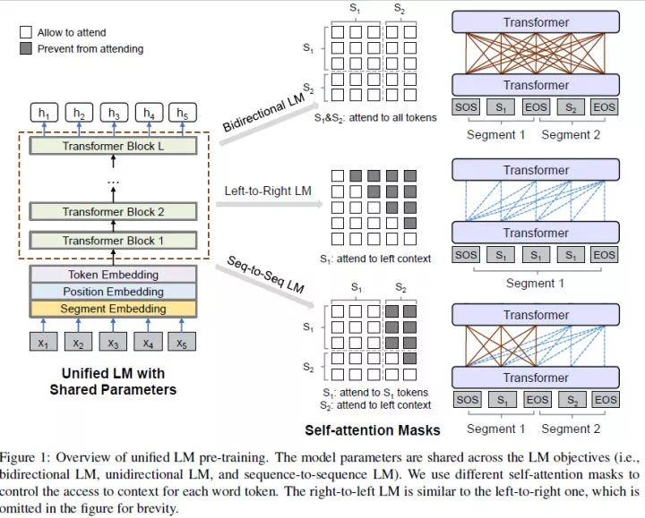 UNILM 就厉害了, 它想直接训一个预训练语言模型, 又能做自然语言理解,又能做自然语言生成。UNILM 的基本单元依旧是多层的 Transformer, 不同的是,这些 Transformer 网络要在多个语言模型上进行预训练: unidirectional LM, bidirectional LM 和 Seq2Seq LM , 下文会忽略一些细枝末节,主要专注如何预训练语言模型的。