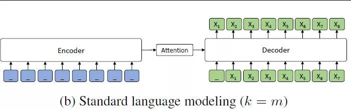 。k = v - u + 1 表示 mask 的窗口大小 , 表示一句话中多少个 token 被 mask 。对于 MASS 的语言模型来说, 其输入为 mask 后的序列