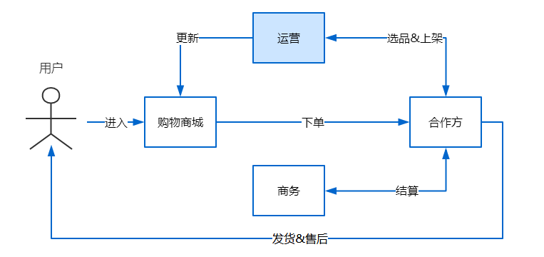 1. 业务包含了用户、商城、运营、商务、合作方(商家)等关键元素。