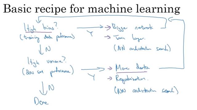 吴恩达解释了研究者识别和处理偏差方差相关问题的步骤。下图诠释了一种解决这些问题的系统性方法。