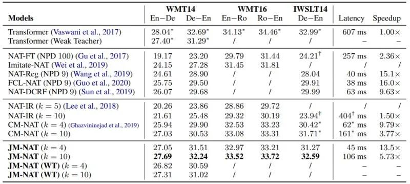 本文在数据集IWSLT14 German-English、WMT16 English-Romanian 和 WMT14 English-German上实验, IWSLT14 De-En 用 small Transformer,其他两个用base模型。其他实验设置详见原文。下表是主要的实验结果: