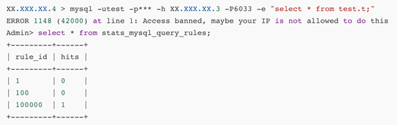 insert into mysql_query_rules (rule_id,active,match_digest,error_msg,apply)values(100000,1,'.','Access banned, maybe your IP is not allowed to do this',1);