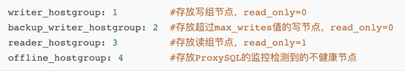 mysql-monitor_groupreplication_healthcheck_interval: 监视组复制状态的心跳间隔,如果成员状态不可得,则被暂时置为 shunned(由 mysql_galera_hostgroups.max_transactions_behind 列控制),默认 1000ms
