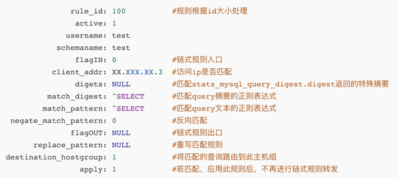 设置一条白名单(注意 rule_id 最小,并且 apply 设置为 0)insert into mysql_query_rules (rule_id,active,client_addr,match_digest,flagOUT,apply)values(1,1,'XX.XXX.XX.3','.',10,0);