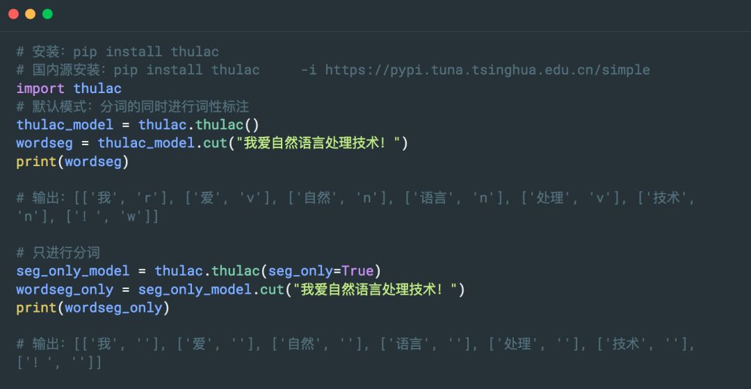 THULAC(THU Lexical Analyzer for Chinese)由清华大学自然语言处理与社会人文计算实验室研制推出的一套中文词法分析工具包,具有中文分词和词性标注功能。