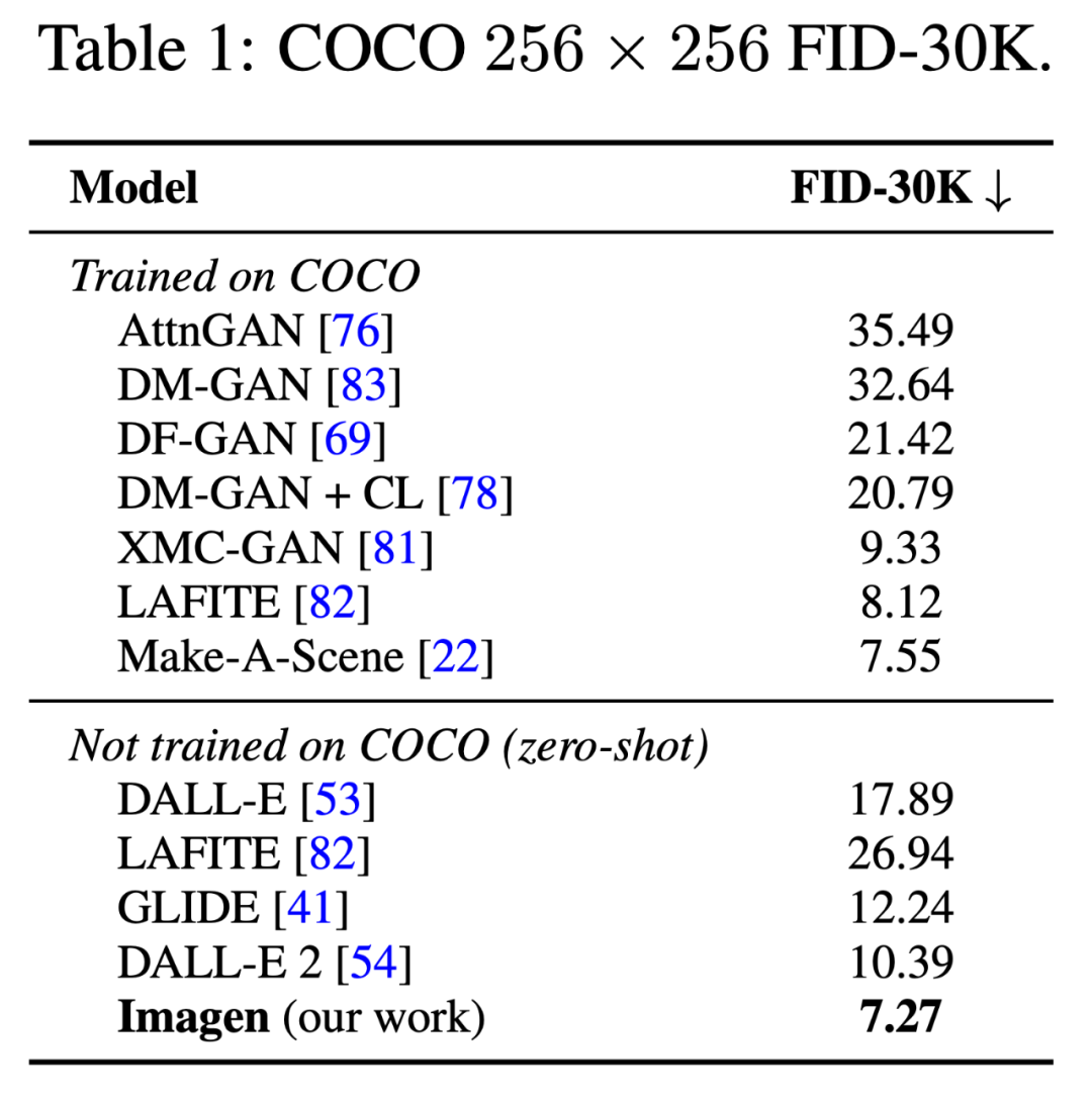 Imagen 以 7.27 的得分在 COCO 上实现了 zero-shot FID 的 SOTA 结果,超越了 DALL-E 2 及其他同期工作,甚至超过了其他在 COCO 上训练的模型。