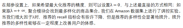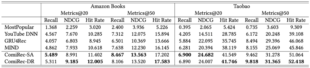 对于多兴趣抽取模块,我们在 2 个公开数据集 Amazon 和 Taobao 数据集上进行了实验,验证了我们所提出的模型的有效性。如下表所示,在 2 个数据集上,我们提出的 ComiRec-SA/DR 取得了最好的效果(SA 表示基于自注意力的方法,DR 表示基于动态路由的方法)。