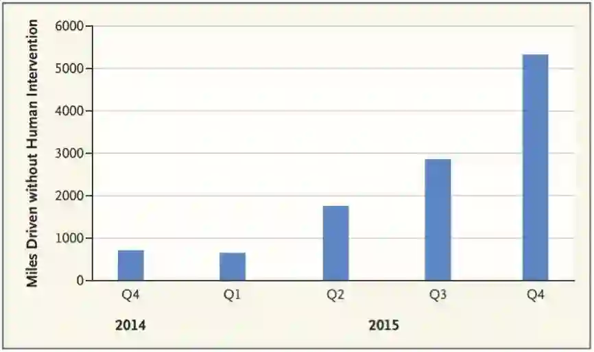这里的数据是谷歌自动驾驶汽车在需要人类干预之前自动行驶的平均英里数。数据来自加利福尼亚州车辆管理局的《自动化车辆参与报告(Autonomous Vehicle Engagement Reports)》。