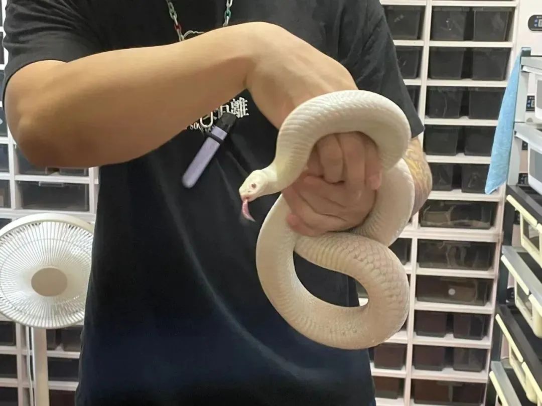 他拿出一条由三个稀有基因组成的布鲁克蛇王,白化、缺黄、缺黑(指只有白色基因,没有黄黑色基因),纯白色外观,配上一双红色的眼睛,国内俗称“暴风雪”。