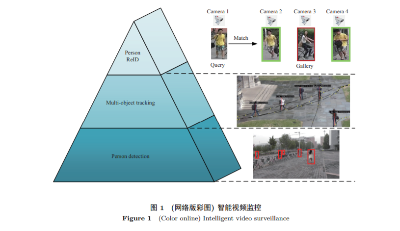 如图 1 所示, 智能视频监控利用模式识别和计算机视觉技术对海量监控数据进行处理和分析, 在 不需要人力干预的前提下, 能够实现对监控目标的自动检测、跟踪以及识别. 行人再识别 (person reidentification, ReID) 作为智能视频监控体系中的关键一环, 旨在解决跨摄像头跨场景下目标行人的关 联与匹配. 具体而言, 图 1 中摄像机 1 捕获的目标行人作为待查询对象, 摄像机 2∼4 拍摄的行人图像 组成候选图库, 将待查询对象与候选图库中的行人逐个匹配, 并在候选图库中找到与待查询行人相同 类别的行人, 从而实现跨摄像头跨场景下目标行人关联与匹配.