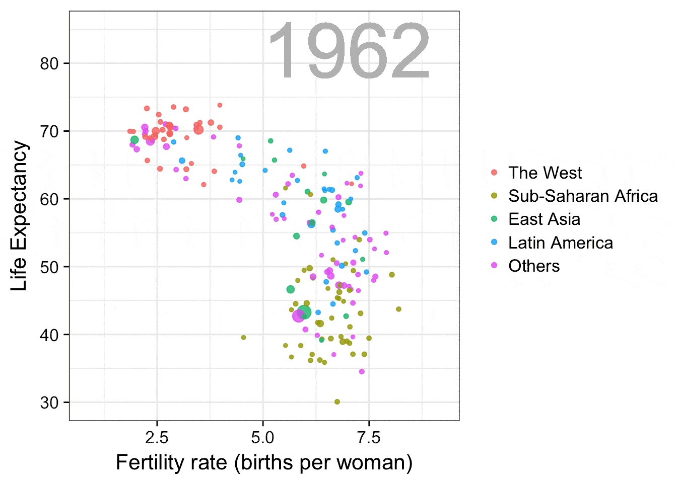 这个gif动图是复制Hans Rosling (https://en.wikipedia.org/wiki/ Hans_Rosling)在他的演讲“关于贫穷的新发现”(New Insights on Poverty,(https://www.ted.com/talks/ hans_rosling_reveals_new_insights_on_poverty?language=en))中展示的动画。该图很好地展现出数据可视化在消除误解方面的作用,Hans Rosling通过这张动图展示了如今并不如40年前一样能够简单将世界划分成两半。之前,人们一般把世界分为拥有更长寿命、较少家庭人口的西方富有国家和较短寿命、较多家庭人口的发展中国家,而这个图向我们展示了这种划分的不合理性。