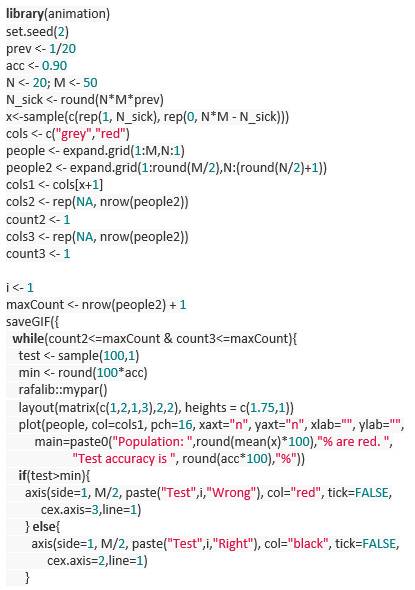 这个简单的动图展示的是将一种非常准确的诊断方法应用于一个发病率很低的群体的诊断结果。它展示出来的是,在已知诊断结果是阳性的情况下发病的先验概率,比该诊断方法的初试准确率要低。你可以用贝叶斯定律来确定真实的条件概率。更多细节请参考这里(https://simplystatistics.org/2014/10/17/bayes-rule-in-a-gif/)。