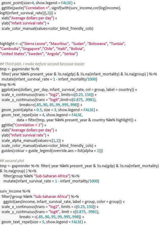 第一张图是地区平均值;撒哈拉以南非洲国家的数值,你可以看到一个平均值被分成数个不同的数值;第三张是所有国家的情况。我标出了一些(与本地区相比)变化较大的国家,并且用了色盲也能识别的颜色。这里的代码有些复杂,原因是我不得不对Gapminder数据进行预处理。