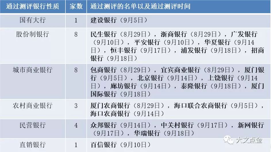 首批通过测评的银行包括25家银行,有以建设银行为代表的国有大型银行,民生银行、广发银行为代表的全国性股份制商业银行,以北京银行、厦门银行为代表的城市商业银行,以及以海口联合农商银行、厦门农商银行为代表的农村商业银行,农村信用合作社、村镇银行等则无一家入围。