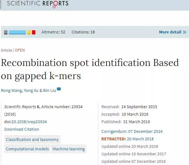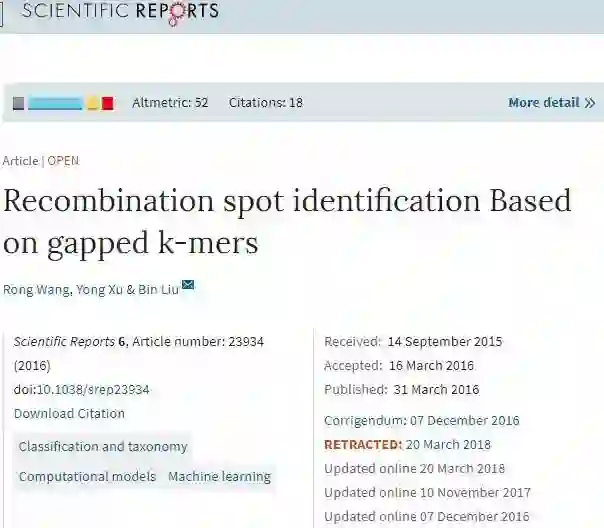 近日,据“撤稿观察网(Retraction Watch)”报道,《科学-报告》(Scientific reports)杂志于3月20日将一篇来自中国学者的论文撤稿,论文标题为“Recombination spot identification Based on gapped k-mers”。